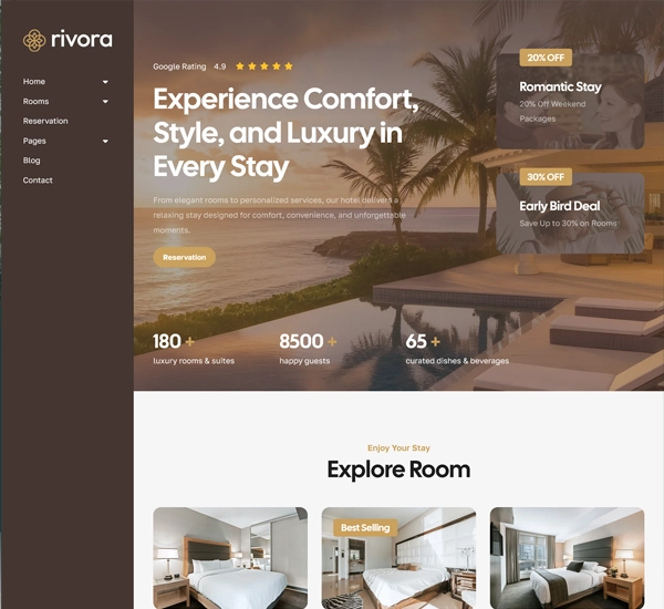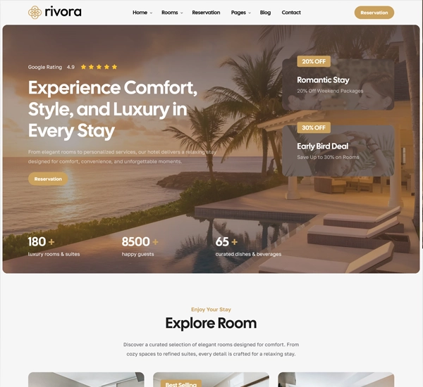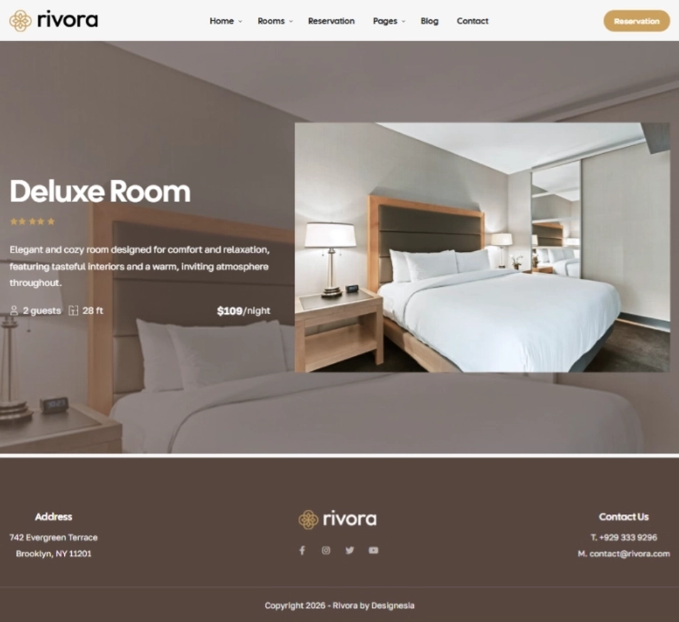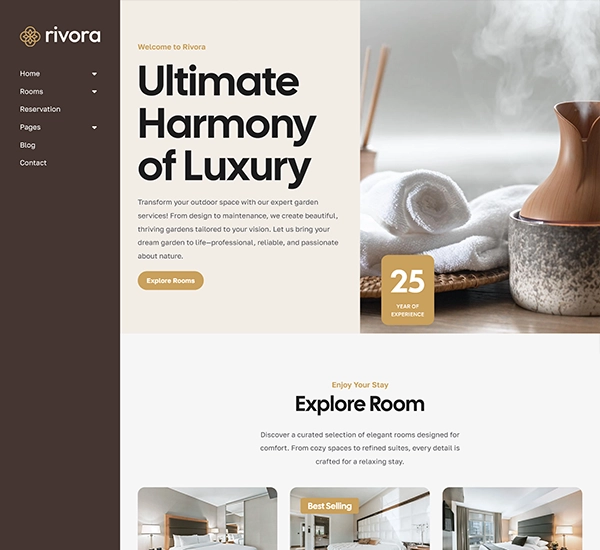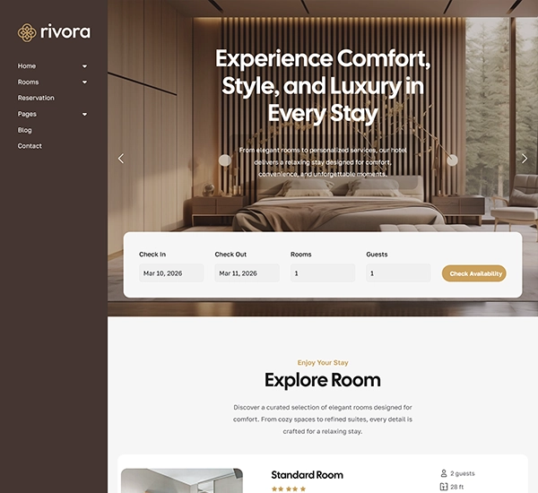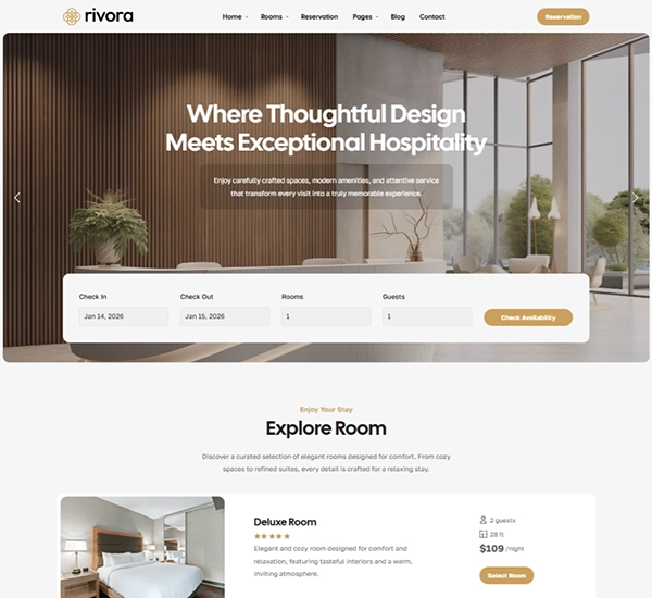 Rivora theme makes creating a hotel website with booking functionality straightforward and efficient. Its built-in room booking system, combined with WooCommerce payment integration, allows you to accept secure online payments and manage bookings seamlessly.